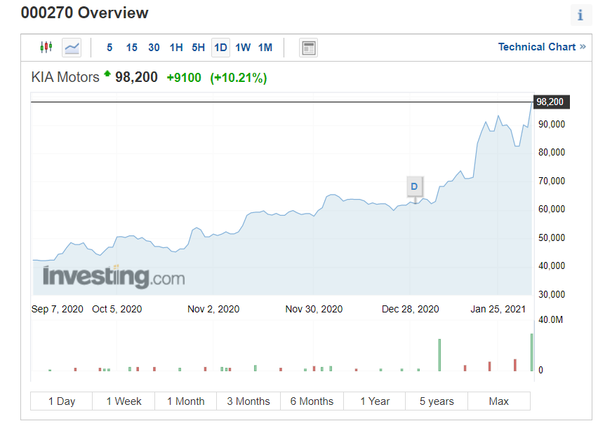 [기아 애플] [애플카 관련 소식] 기아 애플의 협력 소식이 알려진뒤 기아자동차의 주가가 2012년이후 최고치를 기록했다. 당초 현대차와 애플이 3월까지 자율 주행 차에 대한 파트너십 계약을 체