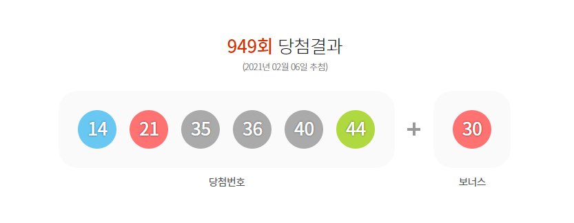 949회 로또당첨번호는 14, 21, 35, 36, 40, 44