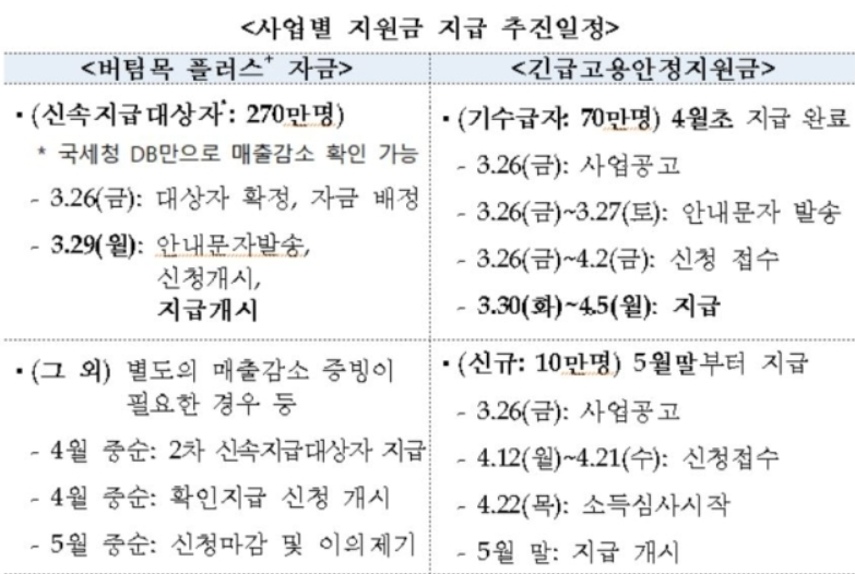 3월 30일부터는 특수 근로자, 프리랜서 등 80 만 명에게 긴급고용안정자금을 지급을 시작합니다. 이미 지원을 받았던 70 만 명은 최우선 순위로 4월 5일 이후에 50 만원이 지급될 예정입니다.