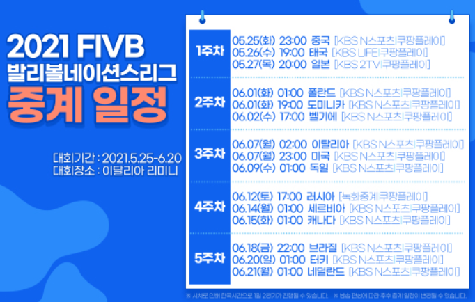 | 여자배구 vnl 중계 무료 시청 / 쿠팡플레이, KBS N SPORTS (0) | 2021.06.01 |