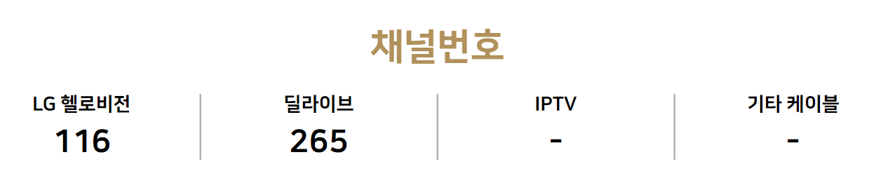 채널번호는 LG 헬로비전에서는 116번, 딜라이브에서는 265번이니 경기 시청전에 혼동마시고 참고하시길 바랍니다.