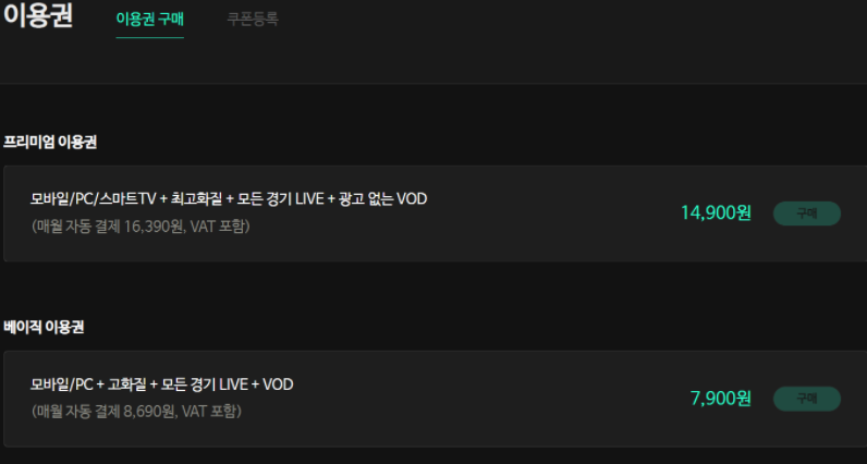 현재 이용 요금제는 프리미엄 이용권, 베이직 이용권으로 나뉘어져 있으며, 보통 대 부분 경기 시청을 원하시는 분들은 매달 7,900원을 지불하고 베이직 이용권을 이용해 실시간 티비 중계를 감상하고 있습니다.