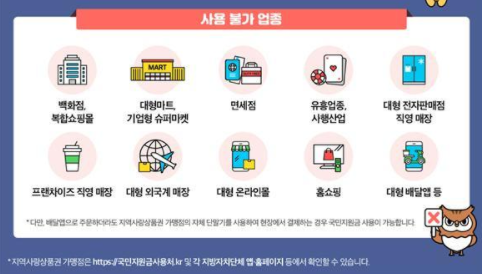 백화점이나 복합쇼핑몰, 대형마트, 기업형 슈퍼마켓, 면세점, 외국계 대기업 매장, 대기업 전자제품 판매 직영 매장, 대기업 프랜차이즈 직영 매장, 대형 배달앱, 온라인몰, 홈쇼핑 등에서는 국민지원금을 사용하지 못합니다.