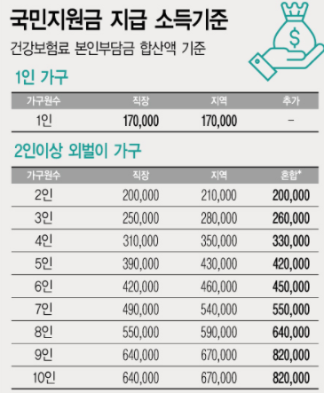지역 가입자 건보료 기준은 외벌이 가구는 2인 21만원·3인 38만원·4인 35만원 이하 등이고, 맞벌이 가구는 2인 28만원, 3인 35만원, 4인 43만원 이하입니다.