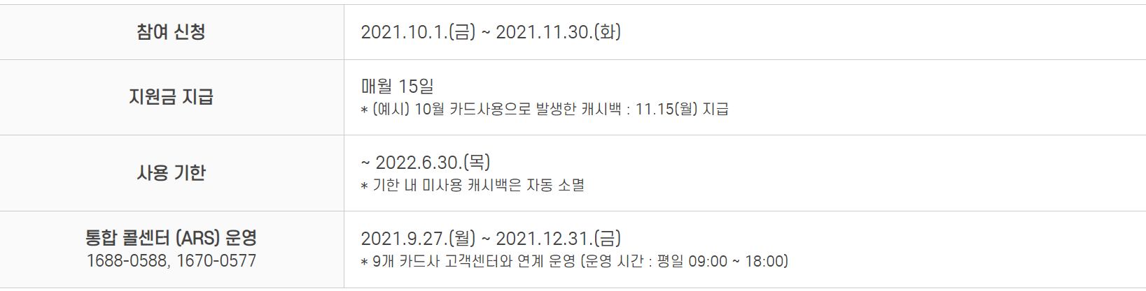 코로나 상생 소비지원금은 신청 시기에 상관없이 10월 1일자 카드 사용분부터 캐시백 대상이 됩니다.