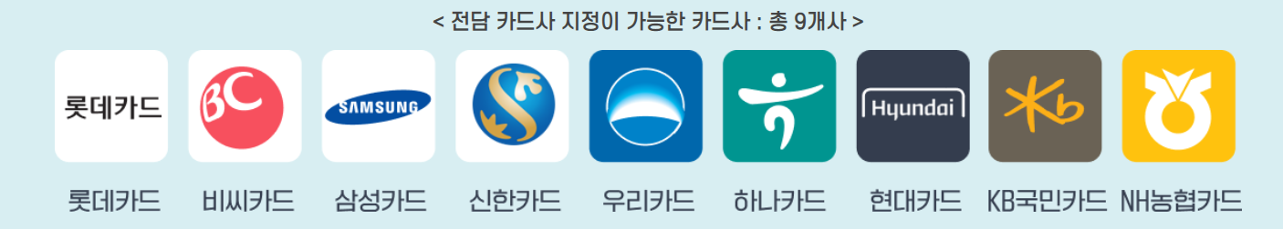 9개 카드사 중 1개 카드사를 전담카드사로 지정하고 카드사의 홈페이지(또는 모바일앱 포함), 고객센터(콜센터), 카드사 연계 은행 영업점을 통해 참여 신청가능합니다.