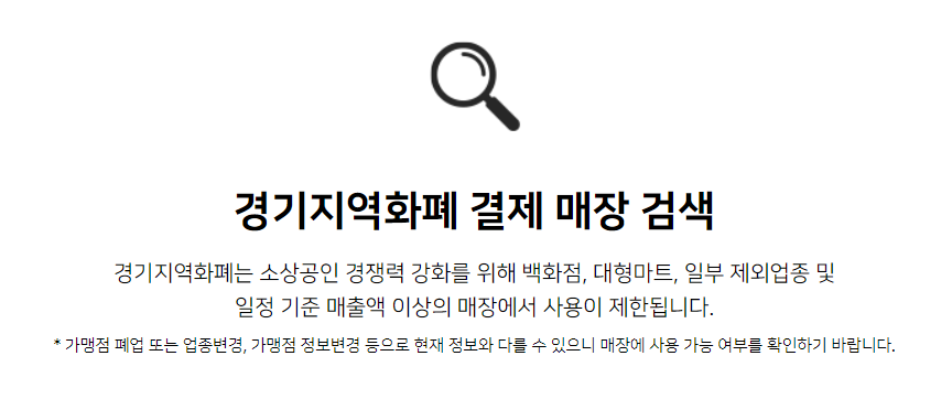 지역경제 활성화를 위해 31개 시·군에서 발행하고 사용하는 대안화폐로 백화점, 대형할인점, 기업형 슈퍼마켓(SSM), 프랜차이즈 직영점 및 유흥 사행업소를 제외한 우리 동네 상점에서 현금처럼 사용하실 수 있습니다.