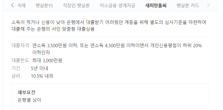 다만 햇살론은 2 금융권이고 새희망홀씨는 1 금융권이라는 점이 굉장히 크게 작용합니다.