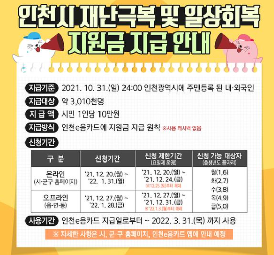 인천시 일상회복지원금 지급대상은 2021년 10월 31일 기준 인천시에 주민등록된 내국인과 외국인입니다. 코로나19 확산 방지 등을 이유로 신청 첫째 주는 출생년도 끝자리에 따른 요일제 신청을 적용합니다.