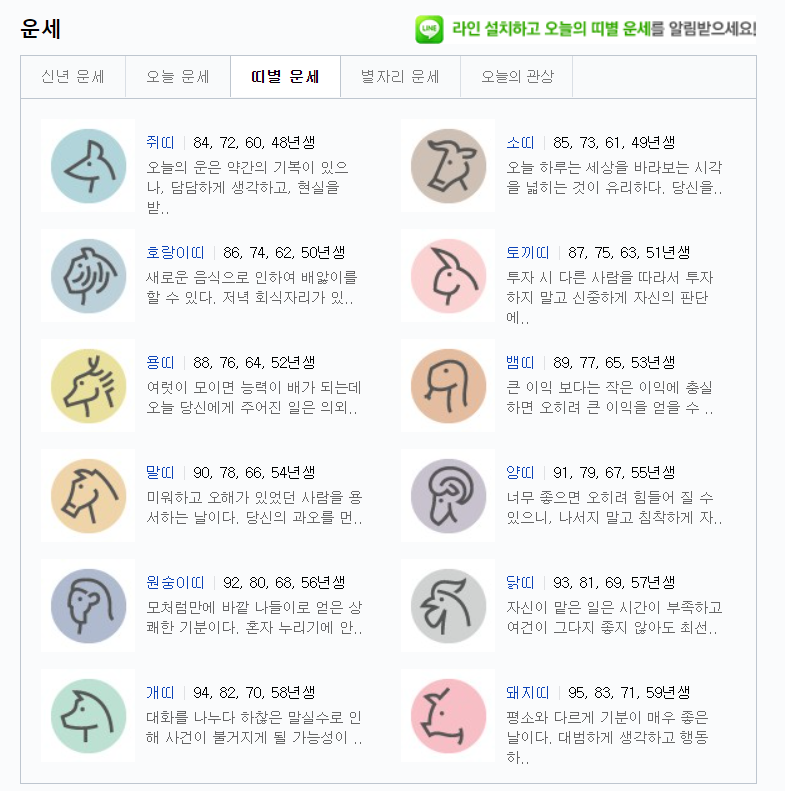 네이버에 접속 후 '운세'라고 간단히 치면 이용할 수 있는 서비스입니다. 신년 운세, 오늘 운세, 띠별 운세, 별자리 운세, 오늘의 관상 총 5개 카테고리로 이뤄져 있습니다.