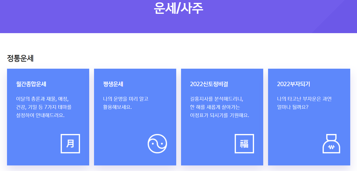 링크에 들어가보면 월간종합운세, 평생운세, 2022신토정비결, 2022부자되기 등 콘텐츠가 있습니다.간단히 한 문장으로 해주는 풀이가 아닌 구체적인 긴 글로 얘기해주기 때문에 믿음이 가는 편입니다.