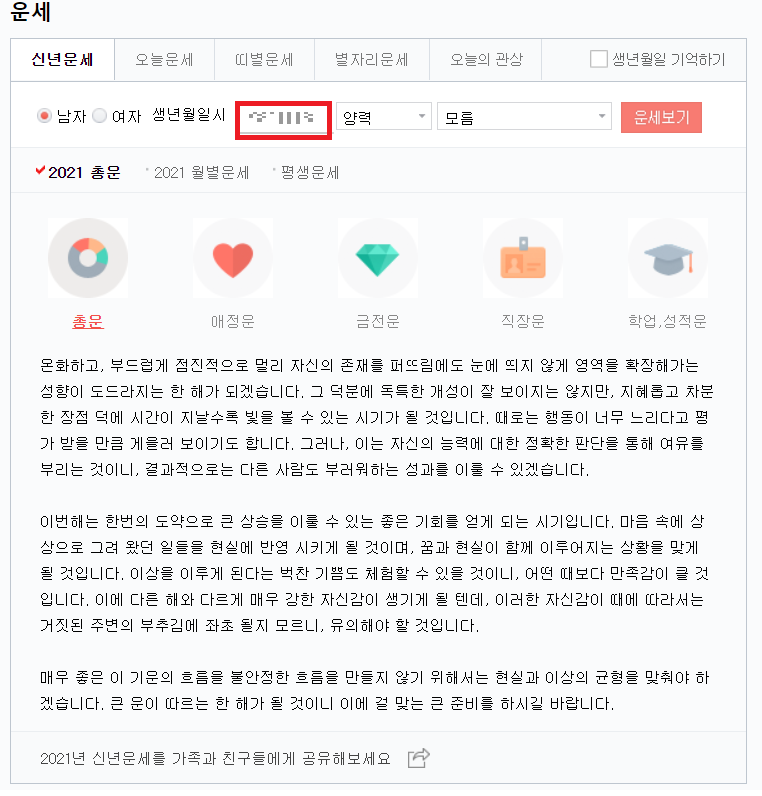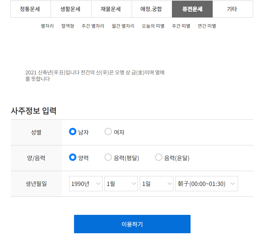 본인의 생년월일을 타 무료운세 사이트에서처럼 같이 간단히 기입 후
