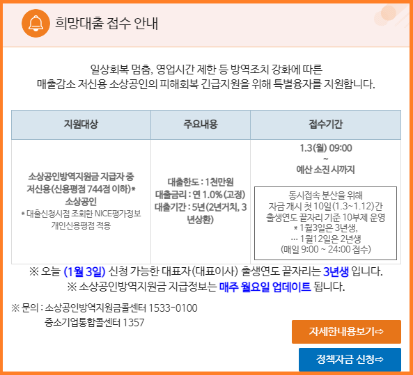 2021년 12월27일부터 소상공인 방역지원금으로 100만원씩 지급이 됐었고 이후 소상공인 희망대출로 3%도 안되는 금리로 대출을해주는다는 얘기에 그전부터 기다리고 계시던 분들도 많습니다.
