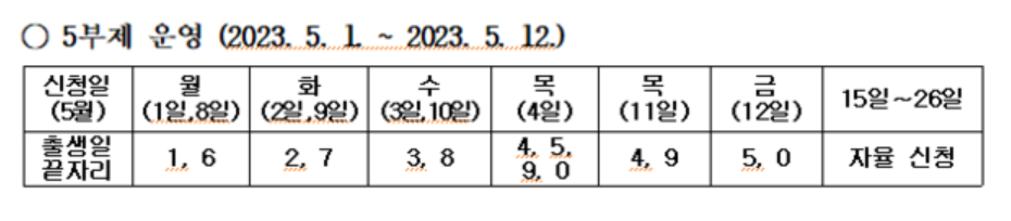 5월 12일까지 초기 2주간은 출생일 기준 5부제로 모집할 예정이며, 출생일 끝자리 기준으로 월요일에는 1·6, 화요일에는 2·7, 수요일 3·8, 첫째 목요일(4일)은 4·5·9·0, 둘째 주 목요일(11일) 4·9, 금요일은 5·0인 경우에 신청할 수 있습니다. 5월 15일부터 26일까지는 자율 신청으로 진행됩니.