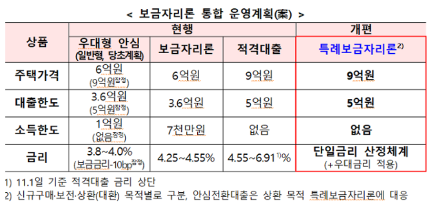 특례보금자리론은 기존 정책 보금자리론, 적격대출, 안심전환대출을 통합한 상품이며. 집값이 9억원 이하면 소득에 상관없이 5억원까지 대출을 받을 수 있습니다.