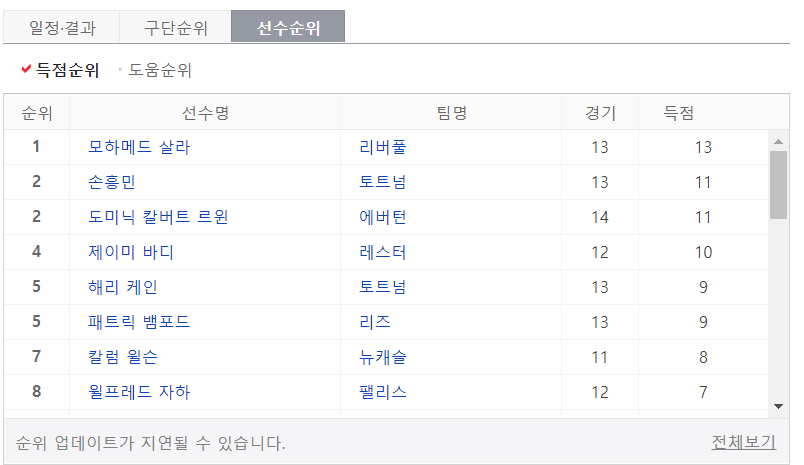 현재 프리미어리그 공동 득점 2위에 올라 있는 손흥민과
