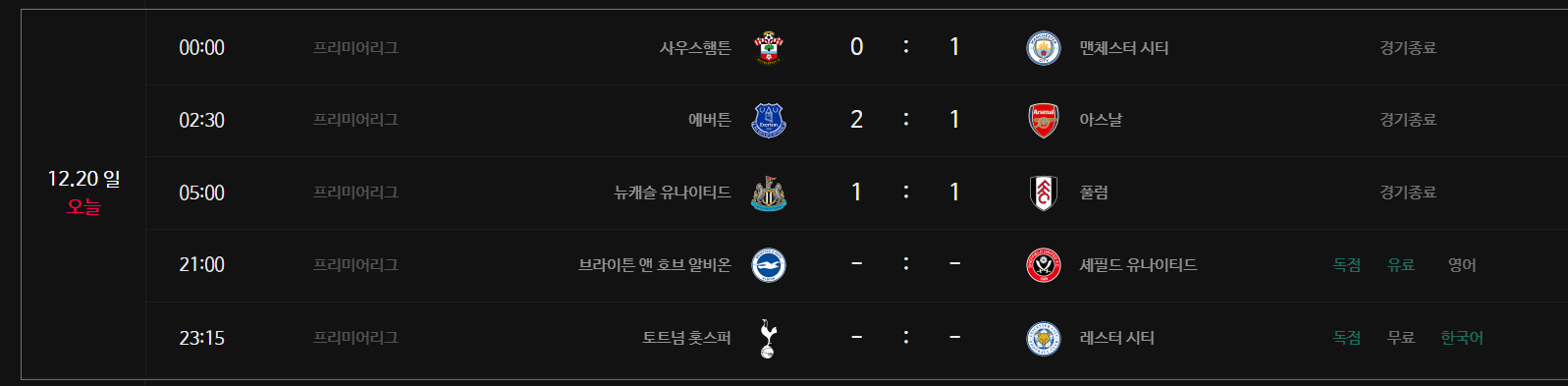 일정을 통해 12월 프리미어리그 경기들의