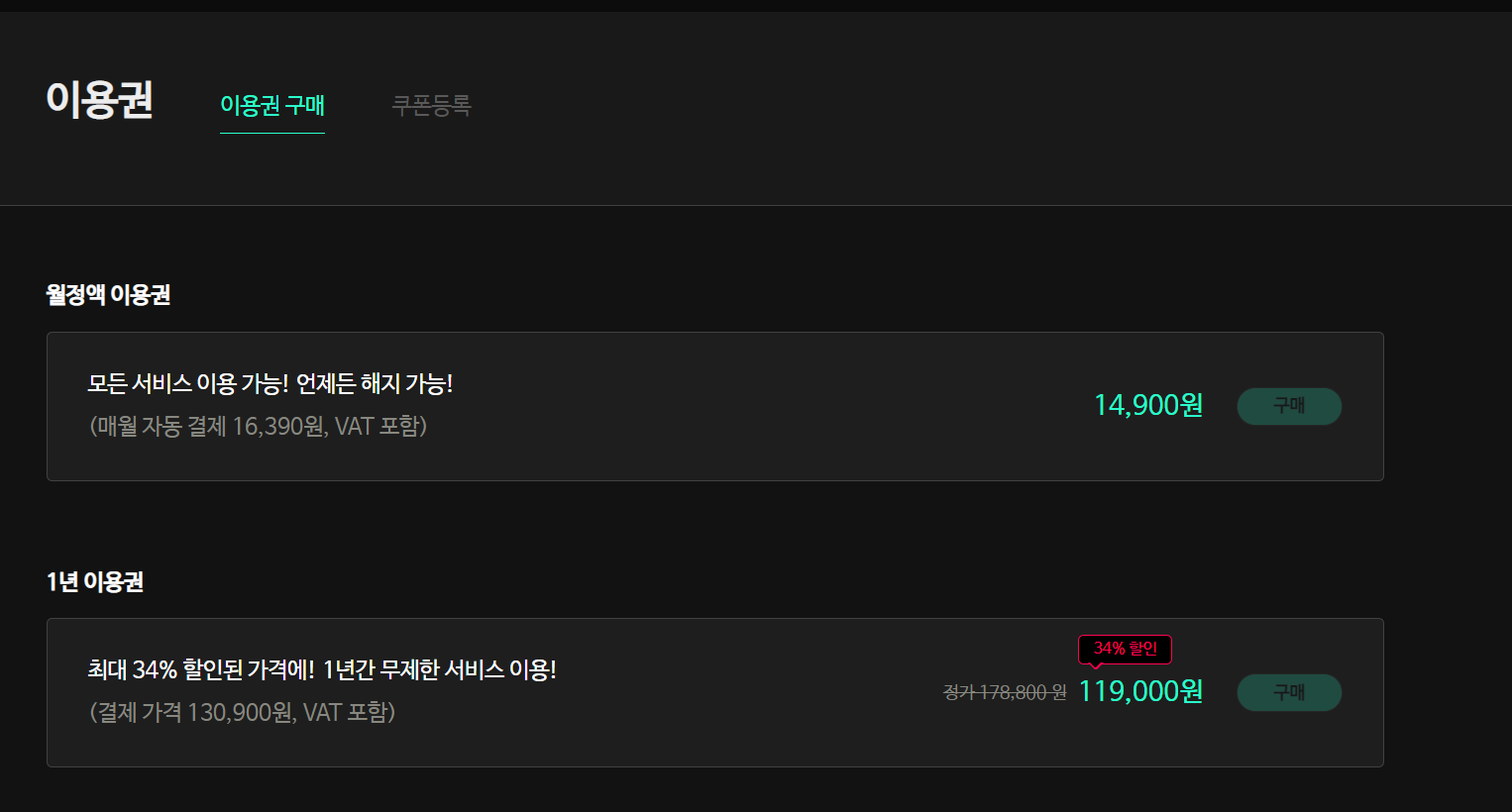 그리고 1년 이용권은 119,000원/12개월
