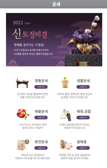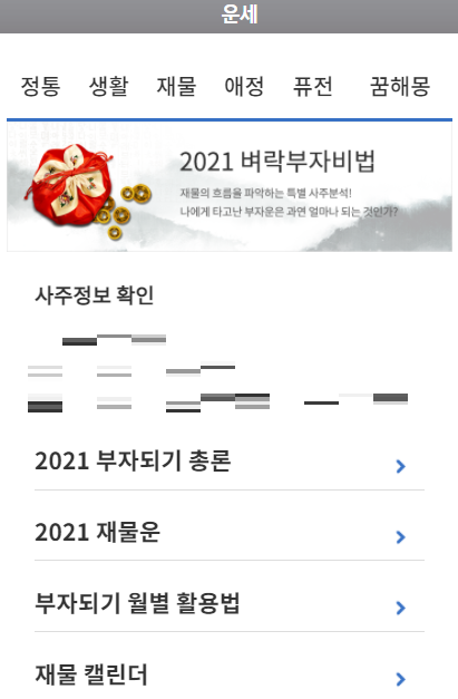 정통 운세, 생활운세, 재물 운세, 애정 및 궁합, 퓨전 운세 기타 등등