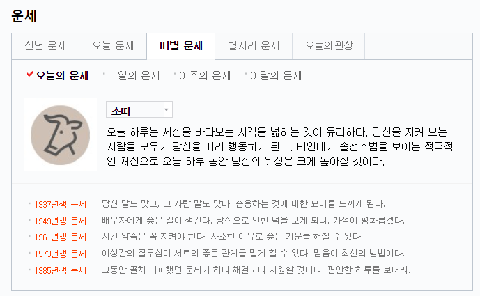 신년 운세, 오늘 운세, 띠별 운세, 별자리 운세, 오늘의 관상