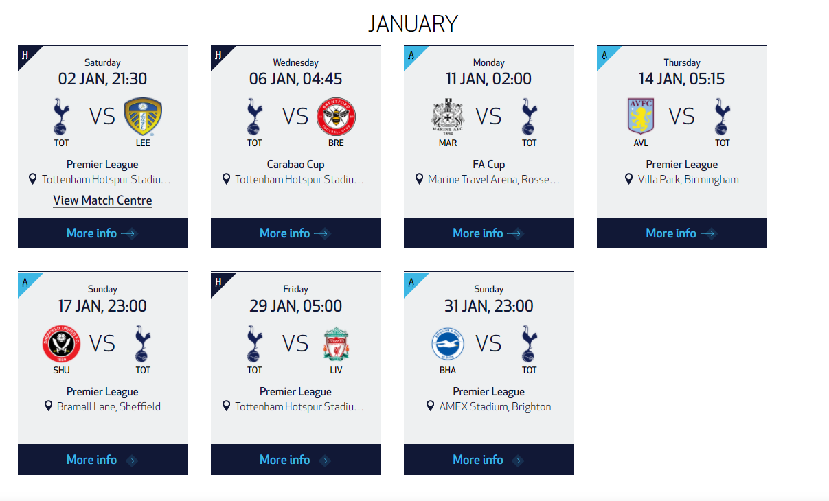 토트넘 경기일정은 1월 프리미어리그 리즈 유나이티드전을 시작으로
