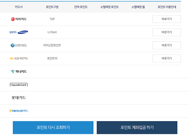 대상 카드사는 일괄적으로 포인트를 조회할 수 있고 현금화 할수있으며,