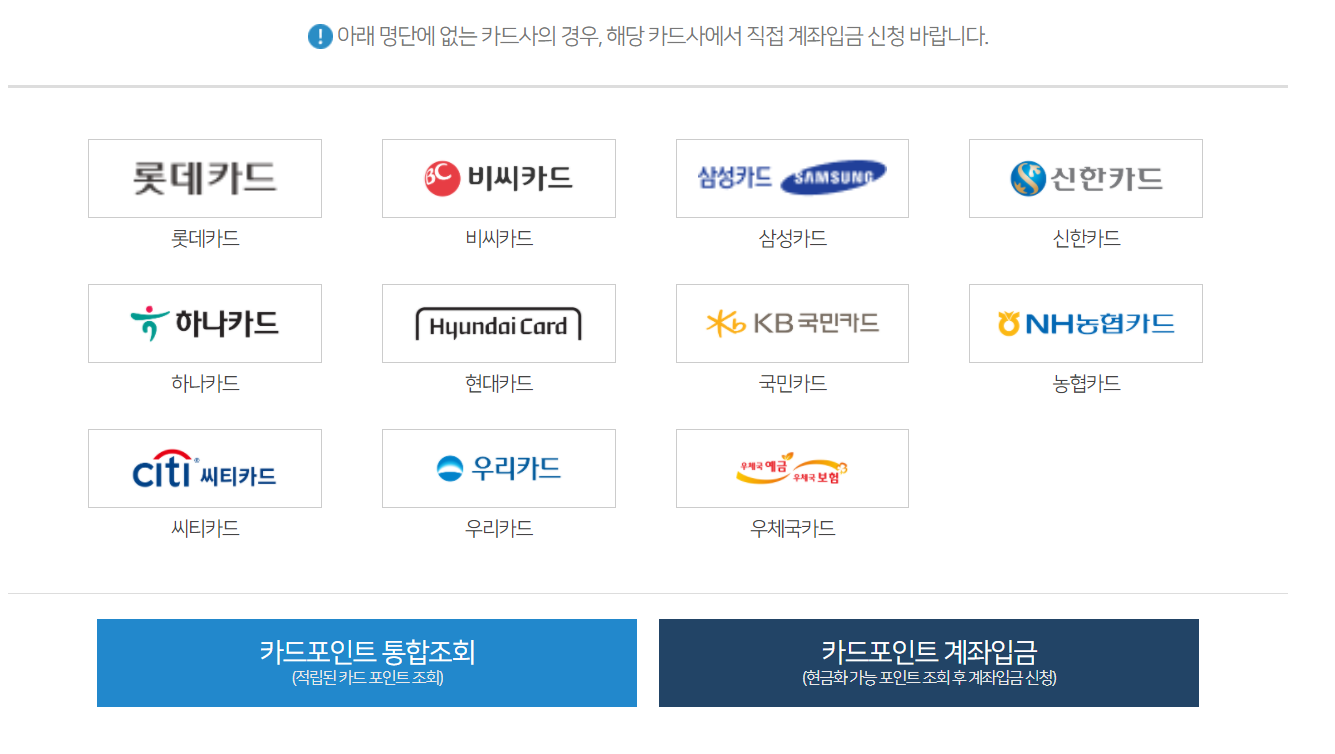 대상 카드사는 일괄적으로 포인트를 조회할 수 있고 현금화 할수있으며,