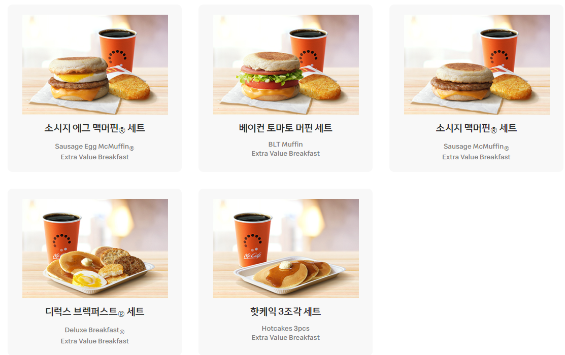 소시지 맥머핀 세트, 디럭스 브렉퍼스트 세트 , 핫케익 3조각 세트로 구성되어있다.