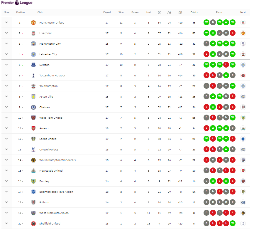 리버풀, 맨시티, 레스터 시티, 에버턴 등등의 팀들이 차례로 위치해 있다.