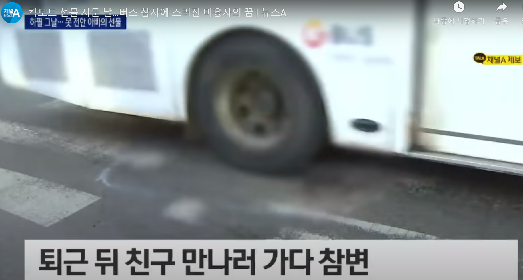 넘어졌고 안타깝게 버스 뒷바퀴에 깔려 그 자리에서 사망하고 말았다.